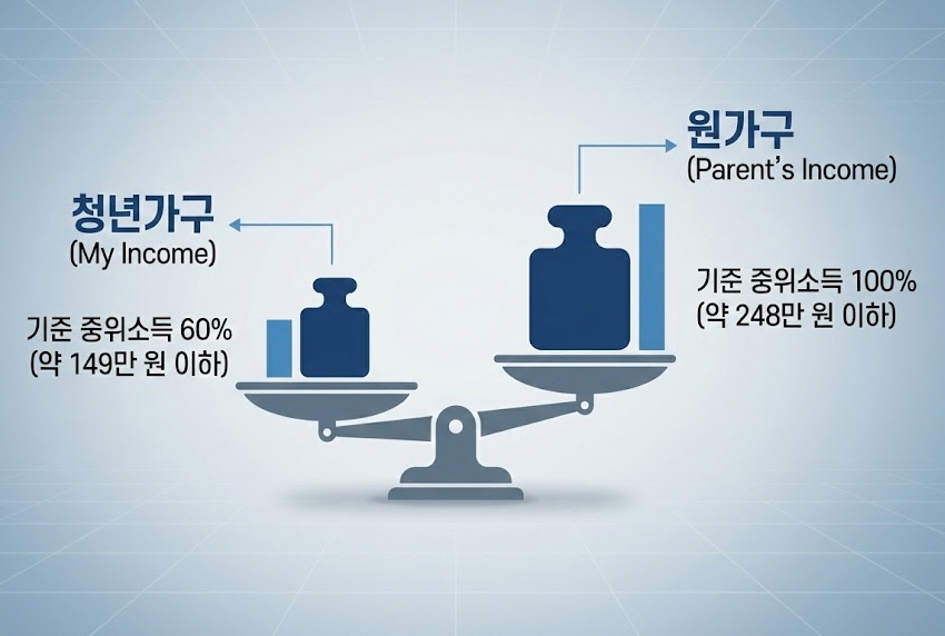 많은 분이 가장 헷갈려 하는 부분이 바로 소득 요건입니다. 지원 대상은 '청년가구(본인)'와 '원가구(부모 포함)'의 소득을 동시에 봅니다. 단, 30세 이상이거나 혼인 등 독립 가구 요건을 충족하면 '청년가구' 소득만 봅니다.